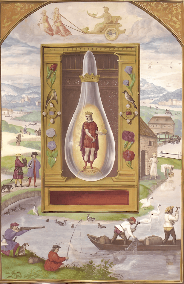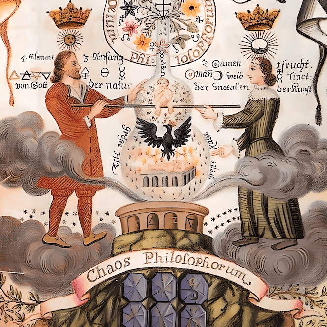 The alchemical coniunctio is the union of opposites — the supreme goal of the opus. In alchemical imagery this is often represented as a Sacred Marriage (hieros gamos) between the Sun King and the Moon Queen, between Sol and Luna, the masculine and feminine principles. Their union in the mercurial bath represents a death and a rebirth: from the dissolution of two distinct entities, something entirely new comes into being.